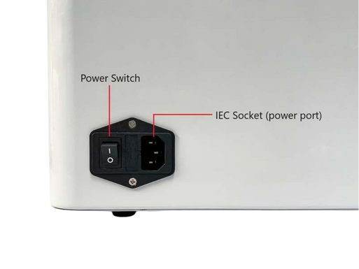 - On the water bath itself, there is a 10-amp male IEC socket (power port). Ensure that the mains plug and switch are easily accessible.