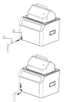 (1) Drain Pipe; (2) Drain Port - After draining, loosen the lock of the drain port in the direction of the arrow as shown in the figure, then quickly pull out the drain pipe.